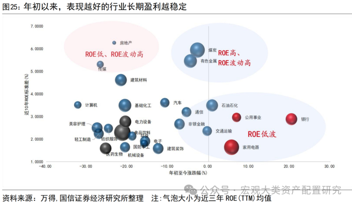 年初至今表现较好的行业不仅具备股价层面的低波动,盈利层面的稳定性同样不可忽视。近 10 年 ROE 波动最高的房地产、传媒、计算机整体表现几乎垫底,ROE 高且 ROE 波动低的行业中,跑不赢全 A 的多为机构配置拥挤度高的行业(如食品饮料、电新、医药),在不存在长期配置拥挤的情况下,“ROE 低波”资产逐渐走进投资者的审美甜区。