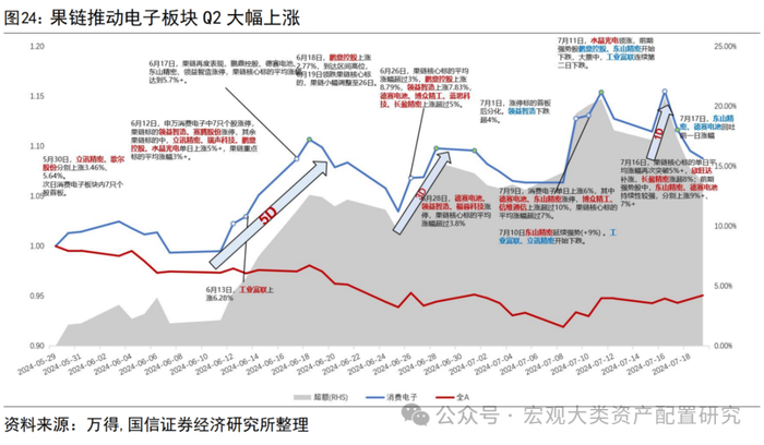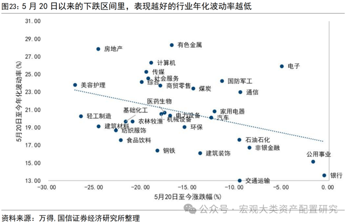 5月下旬市场开启调整以来,低波类资产表现更好。我们以5月17日高点回调以来31个一级行业的区间涨幅与区间年化波动进行对比,不难发现,表现最好的银行、公用事业是年化波动最低的,TMT、房地产等高波动行业表现较差。涨幅排名前5的行业除电子受果链驱动叠加多个细分板块景气确定性回升外,波动率均在趋势线下方。