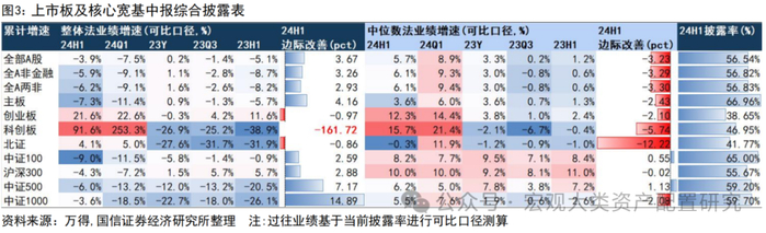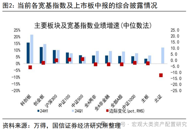 从中报已披露样本及可比口径看,当前A股分子端修复预期不明朗。截至2024年8月26日0:00,全A中报预告、快报、中报综合披露率达到56.5%,全A两非达到56.8%。从当前披露样本的整体法口径看,全A非金融、全A两非1H24业绩增速分别为-5.9%、-6.2%,相对1Q24边际改善3.26、2.93pct。但从中位数角度看,各上市板当前披露样本1H24相较1Q24均出现边际走弱,其中已披露样本中“尖子生”较多的科创板和创业板体现得尤为明显。已披露样本1Q24中位数增速在20%+的科创板,1H24边际走弱5.74pct。宽基指数方面,中证100、沪深300、中证500呈现出相对稳定的特征,中位数口径的增速边际变化在±1.2pct以内,中证1000当前披露情况相对割裂,业绩贡献度较大的企业提供了更强的正向拉动效应,整体法口径修复明显,但中位数口径边际走弱2+pct,当前披露样本两极分化情况较为严重,预计伴随中报完全披露后,中位数与整体法口径下的增速差将有所收敛。