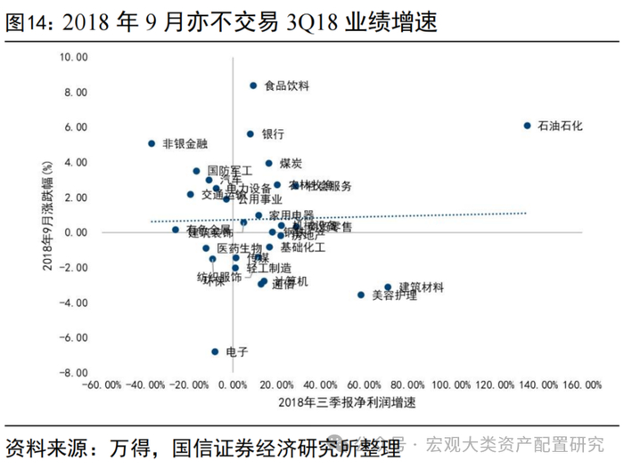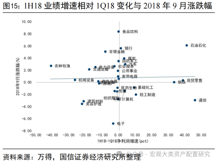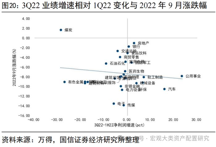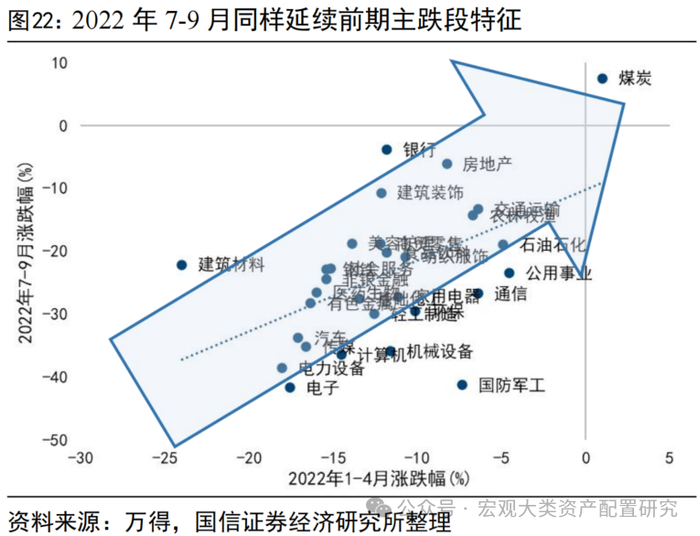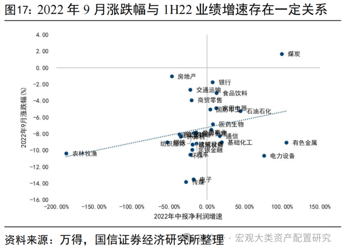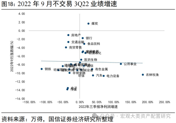 中报落地后,行业层面不交易中报增速或加速度,高低切特征不明显。我们以半年报增速、三季报单季度增速、一到三季度季累增速相对中报的边际变化、中报相对一季报的边际变化四个口径,对中报季结束后的一个月各行业涨跌幅进行验证,不难发现除了剔除社服和农业后2022年9月的涨幅与1H22的业绩增速存在一定正相关关系外,其余口径相关性不明显。即中报落地后,行业层面既不交易增速、也不交易“加速度”。从一级行业层面看,2018年4-8月经历了一轮较为明显的加速下跌,9月反弹,但整体延续前期主跌段特征,全年维度在去杠杆和信用利差提升的背景下,现金流稳定、资产负债率低的公司强者恒强。类似地,2022年在5-6月反弹结束后,7月起市场重回下跌通道,从各行业表现情况看,全年下跌区段内的一致性特征较强,1-4月和7-9月占优的均为煤炭、银行、地产、交运等,成长类资产承压更显著。