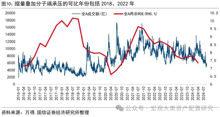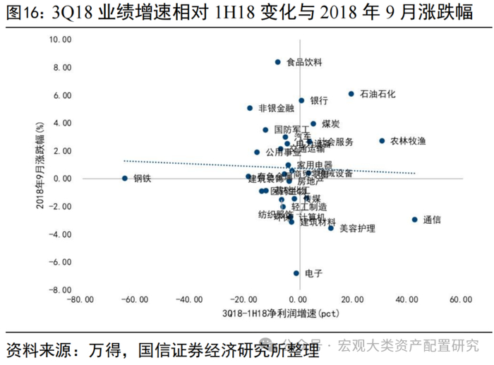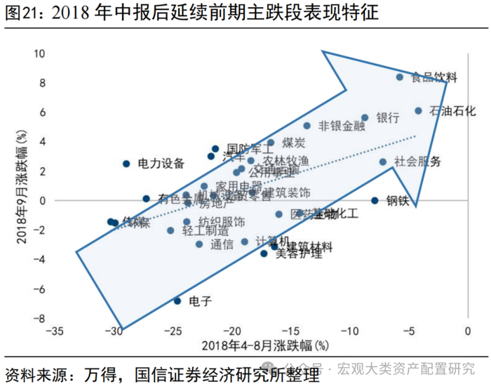 收、利、ROE共同判断分子端下滑、同时中报落地后开始缩量的年份包括2018、2022年。1)2018年中报披露期间成交额从4000亿缩量至不足3000亿,地量成交贯穿9-10月,分子端看,ROE从10%的高点开始下滑,2020年Q1到达底部。增速方面,全A两非营收增速跌破15%,净利润增速自2017年35%的高点下滑至21%,1H18处于整个分子端走弱的过程中。2)2022年二季度,全A两非ROE经历了一年的持续下行,单季度利润增速滑落至3%以下,成交额则从8月中旬的万亿附近溃缩至9月末的6000亿。上述两段分子、分母端支撑不明显的时间段,中报落地后的特征与行业表现对当前具备一定指引意义。