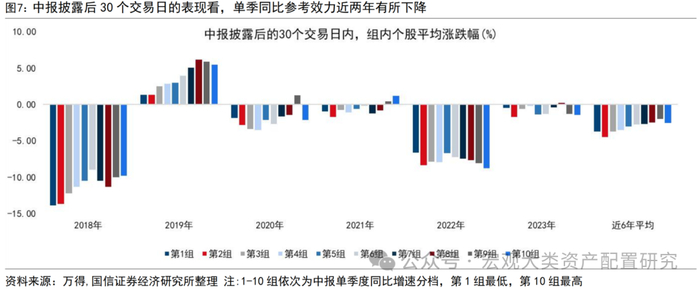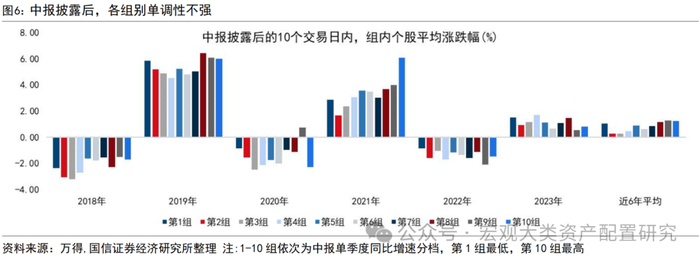 自下而上看,中报交易基本面的抢跑效应明显。我们以个股实际披露日期为分界线,按当年Q2单季度业绩增速由低到高分为10组,对中报落地前和落地后的股价表现进行对比。中报披露前的10个交易日内,整体呈现对中报预期的抢跑,当年二季度单季同比增速最低的组别表现普遍较差,单季度增速高的组别表现较好。而在中报披露结束后的10个交易日内,增速较低与增速较高的组别差距不明显,但值得注意的是,单季度增速最差的组别在中报落地后的10个交易日内的表现,多数年份高于10组的平均水平,极端利空落地后反而不再杀估值。
