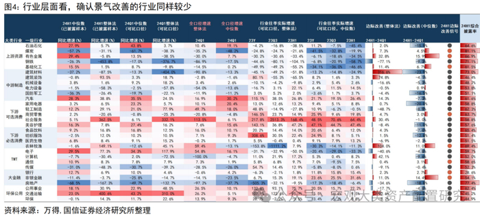 同时考虑整体法&中位数口径下的变化,当前仅有不到1/3的一级行业存在明显边际改善信号。基于当前披露率及可比口径测算,整体法、中位数均边际改善的行业仅有煤炭、有色、化工、零售、农业、银行、非银及通信。上游方面,煤炭在80%+的披露率加持下,当前业绩能见度较高,受制于市场需求放缓、价格下降、资源税税率提高等共同原因作用,板块整体承压明显,5pct以内的边际改善对-60%的低迷增速不构成太大影响。有色、化工修复更明显,前者受益于行业市值前4个股整体业绩表现较好,以工业金属为代表的部分板块产销双旺,量价齐升,对业绩形成提振,后者行业内部化学原料、化学制品业绩表现较好,在70%、62%的披露率加持下,1H24中位数增速分别达到23.9%、17.4%。零售行业中仅有贸易边际改善明显,一定程度上受益于1Q24的低基数。非银金融中的证券、保险同样依赖于1Q24的承压表现,当前披露样本1Q24整体法业绩增速分别为-41.2%、-4.6%。不难发现,倘若考虑基数情况,当前真正实现景气边际改善的仅有通信设备,A股目前仍处于景气相对稀缺的状态。