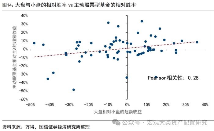 基本面与市场集中度的背离,拖累了权益投资组合的表现。出于费率的因素,基金组合往往通过中长期博弈减少短期换手次数,这内在的要求了基金组合的配置理念更偏向于基本面,但当下权重股基本面的走强和涨幅的相对走弱构成了一定限制。从现实数据来看,权益基金更多地配置于高市值股票,且A股市场的主动权益基金与大盘的相对胜率呈现正相关关系。
