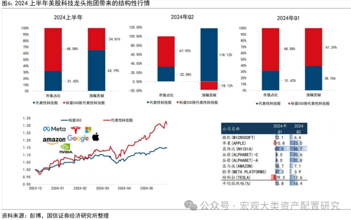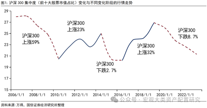 市场集中度的上行存在天花板。以美股为例,2024年前两个季度,500指数中“科技七巨头”占比达到31%,触及2000年以来的最高水位。在此期间,“七巨头”为500指数贡献了绝大部分的涨幅,这体现了市场集中度上行时权重股对指数的拉动作用。但三季度以来,资金对权重股的押注有所减弱,交易逻辑不断切换,“七巨头”迎来大幅回撤,市场集中度也随之下调。从A股数据看,市场集中度走高时往往伴随更多的上涨,2006年至今,沪深300在两次集中度上行区间中均有正收益,而在三次集中度下行中有两次出现显著的负向收益。