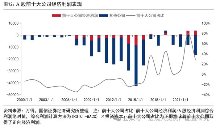 综上,基本面视角下A股市场集中度有望延续上行。2021年底以来,A股市场经济利润为负,而前十大公司取得了正的经济利润,成为价值创造的“优等生”。在基本面视角下,头部权重股突出的价值创造能力意味着市值的更快增长和市场集中度的上行。2021-2023年间,前十大公司经济利润从721亿元提升至3793亿元,同时A股总经济利润从-8968亿元下降至-1.3万亿元,但其市值占比仅从13%提升至15.9%,提升至2002和2020年的水平。对比来看,2002年、2020年前十大公司经济利润仅为-250亿元和-7亿元(A股总经济利润为-1473亿元和-8081亿元),完全落后于近3年的利润表现。