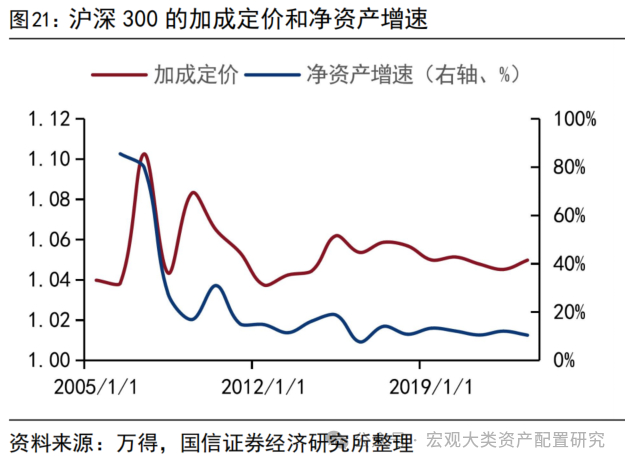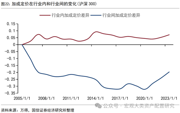 以沪深300为代表的大盘龙头,其加成定价较为稳定。相比于全部A股的分析,以沪深300为代表的大盘股具有结构优势,基金组合的配置考虑策略容量和购买量还是会优选大市值标的。数据表明,沪深300的加成定价在过去的十几年中维持稳定,这与前文中提到的权重股在A股市场是价值创造的“优等生”假设不谋而合。但从相对趋势来看,大盘股的加成定价变化依然与净资产增速成正比关系,与净资产收益率维持反比。长时间维度看,行业内加成定价的差异在扩大,行业间加成定价的差异在缩小,这表明市场竞争在行业间更为剧烈,行业所独有的竞争优势被削弱。