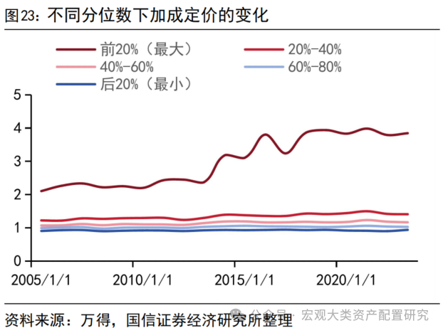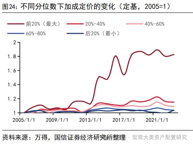 加成定价数据亦表现出A股企业的“赢者通吃”的特征,即高定价权公司在长时间持续强化自身的市场地位。根据加成定价的数值大小,本文将其分为五个组别分别观察其趋势变化,发现无论从绝对变化还是相对变化(定基)看,定价权正在前20%的公司能够持续扩大其优势地位,在20年间增加了约83%,而定价权分位数在[20%,40%]、[40%-60%]、[60%-80%]、[80%-100%]的公司分别增长了15%、9%、4%和4%,远远落后于头部公司。