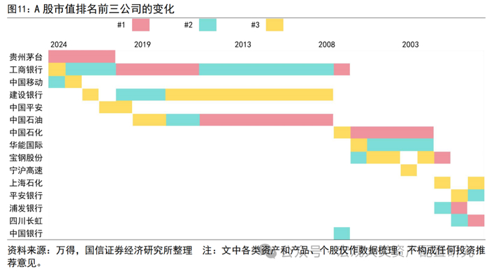 在A股市场集中度下行区间中,头部权重股迭代速度明显变慢。1999-2007年间,A股市场的集中度不断上行,期间有9支股票不断角逐前三大市值的位置,最大市值的股票在8年间经历了“四川长虹-浦发银行-宝钢股份-中国石化”的轮动。而在2008年及之后,前三大市值股票仅在6支股票中出现,以年初市值口径定基统计,仅有工商银行、建设银行和中国石油3支股票登上最大市值的榜单。