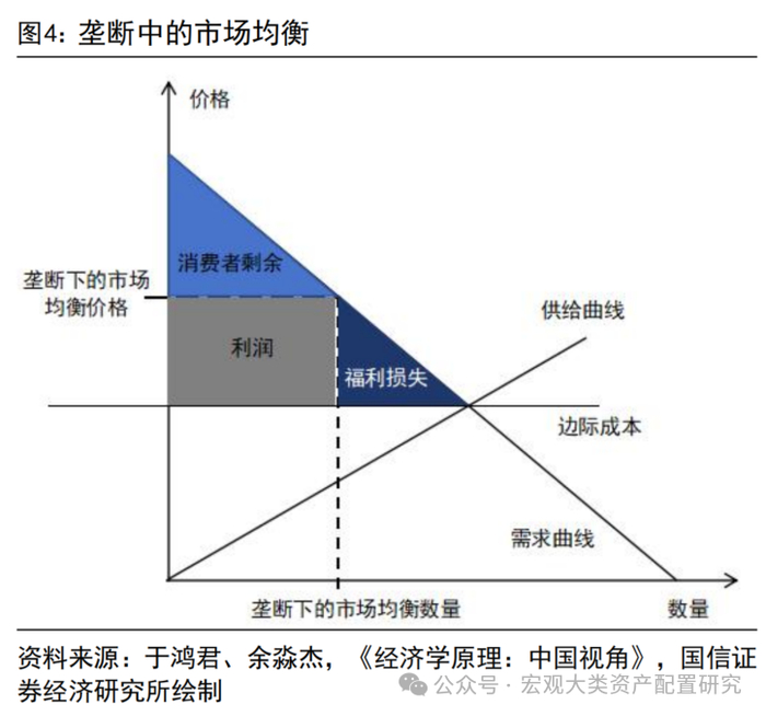市场集中度与企业竞争优势的关系是相互促进的。一方面,有竞争优势的企业会在消费市场中占据主导,提升自身的市场地位。另一方面,在一个高度集中的市场中,头部企业往往会通过一定的定价策略获取超额利润,以保持竞争优势。在一个垄断市场的均衡中,头部公司将价格提高到高于成本的水平并获取超额利润,此时相比于竞争市场均衡来说,虽然企业获得更多的利润,但消费者福利(消费者剩余)和总体福利(福利损失)均有所下降。