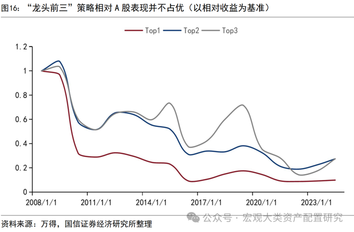和美股七巨头行情不同的是,国内如果每年遴选龙头公司的市值排名前三家进行投资则收效甚微。行情历史上市场竞争化带来股市集中度下滑,除去特定的核心资产行情外,市值排名居于首位的龙一股票表现较龙二、龙三反而并不占优。2008年至今,取排名前三的股票构建组合则平均年化收益率为3.1%,相对全A市场年化收益率跑输了3.4%,且波动率大于全A市场。以策略组合的视角看,在每年的年初选择市值排名前3的股票,计算其相对于全A市场的超额收益率,然后计算其累计净值表现,发现市值排名第一的股票显著跑赢全A,排名第二至第三的股票同理。和美股不同之处在于A股龙头公司在行业上变迁较快,且相较美股的科技板块,A股龙头公司更多集中在传统行业,为经济发展阶段客观规律所致。因此,相比美股头部集中在个位数几家公司,A股的龙头公司投资要扩圈到核心资产属性的50、100或者300指数样本公司中。