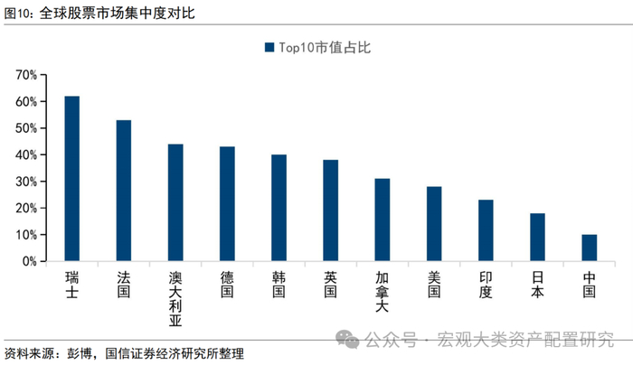 A股的竞争优势变化历程回溯和展望。当下市场集中度处于下行区间达到充分发挥优势局面,未来部分企业出清后龙头行情带动集中度上行空间较大。截至2023年底,万得全部A股口径显示A股市场中前10、前3、和最大的股票市值占比分别为15.9%、6.8%和2.5%,处于历史较低位置。横向对比来看,明晟全球指数前十大股票约占总市值的19%,这一比重在美国股市中约为27%。此外,在彭博数据口径下,中国股市集中度在主要国家股市中排名中处在洼地。所以,无论从纵向还是横向来看,A股市场的集中度依然存在上行空间,2023年龙头公司已有苗头。