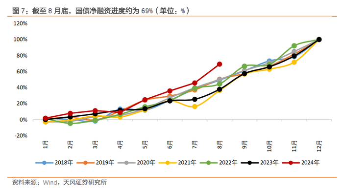 第一,年初财政预算赤字率仅有3%,而去年10月底调整财政预算后赤字率为3.8%,赤字率仍有提升的空间。第二,今年国债发行进度快于往年,截至8月底,国债净融资进度为69%,较2022年加快了25个百分点(2023年因增发国债不具可比性),如果增发国债也不会带来太大的供给压力。第三,政策性金融工具等准财政工具需要对应具体项目,对于补充财政收入缺口尤其是一般公共预算缺口而言,直接效果不如国债。
