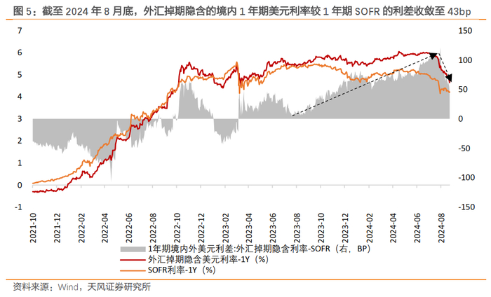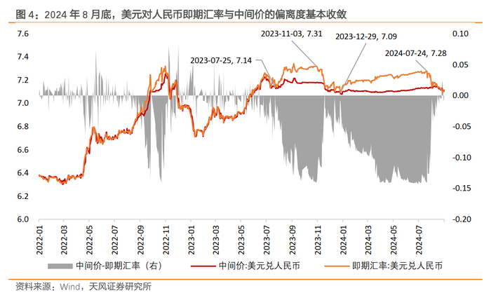 去年8月以来,财政和货币的政策空间或多或少都受到了汇率贬值压力的约束。但是稳汇率的压力近期出现明显减弱。截止8月底,美元指数101.7,较6月底回落了3.9%,美元兑人民币即期汇率与中间价之间的偏离度也基本收敛至0,说明央行当前无需动用逆周期因子来缓解人民币贬值压力。另外,外汇掉期隐含的1年期美元境内外利差也由7月底100bp收敛到了8月底43bp。