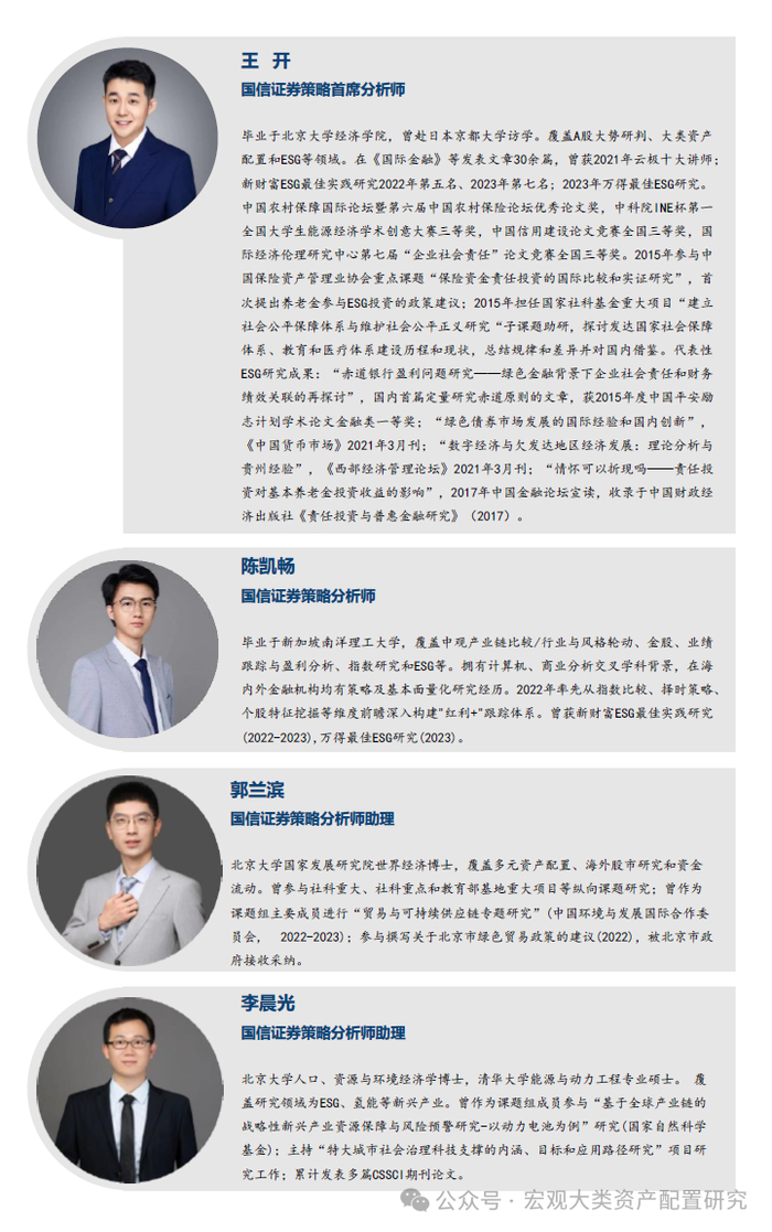 国信策略团队目前共有四位成员,研究覆盖A股策略和资产配置、ESG等方向,我们将过去一年部分成果整理为全球启航(资产配置)、出海破局(ESG)、新质生产力(A股策略)三大合集,进行精选回顾。感谢各位的关注与支持!