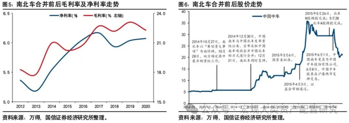 拆分后的南北车实现了快速发展,但是南北车在主营业务上高度重合,导致互相压价的情况时有发生。特别是在“一带一路”倡议实行后,两家公司均开始“走出去”,加快出海步伐布局海外市场。但是,在走出去的过程中,南北车内卷式竞争在一定程度上影响了各自的发展,为有效整合行业资源,避免内卷式竞争,南北车最终以对等合并的方式合二为一。2014年10月28日,南北车以“筹备重大事项”为由停牌;同年12 月 30 日,中国南车发布重组公告,宣布吸收合并中国北车;12月31日,南北车复牌,分别连续6个交易日涨停;2015年3月6日,南北车合并获国资委批准;4 月3日,南北车合并获证监会审核通过;6月8日,中国南车股票简称变更为“中国中车”,同时在沪港两市交易。