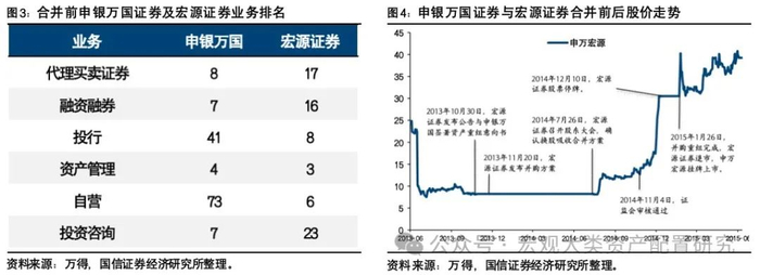 申银万国证券与宏源证券均隶属汇金系,汇金公司持有申银万国证券55.38%股份,通过子公司建银投资持有宏源证券60.02%的股份。两家券商在业务上各有所长,申银万国证券在证券经纪、证券投资咨询等业务方面具有较强的优势;宏源证券在投行和创新业务板块排名居前,二者合并有助于实现优势互补,打造实力较强的综合性券商。2013年10月30日,宏源证券发布公告与申银万国签署资产重组意向书,宏源证券股票停牌。2014 年 7 月 25 日,宏源证券发布重大资产重组预案,将与申银万国证券进行合并,并确定换股价9.96元;11月4日,证监会发审委通过申万宏源的合并方案;12月10日,宏源证券股票停牌,自发布重大资产重组预案至股票停牌,宏源证券股价大幅上涨276%;2015年1月26日,并购重组完成,宏源证券退市,申万宏源挂牌上市,按照换股比例折算,上市首日,股价即上涨32%。本次并购重组显著缩短了申银万国证券的上市进程。两家券商的强强联合,实现了优势互补,产生了“1+1>2”的协同效应,这不仅有助于双方发挥各自的业务强项,还促进了区域间的联动,实现了规模经济,为公司带来了更广阔的发展空间。