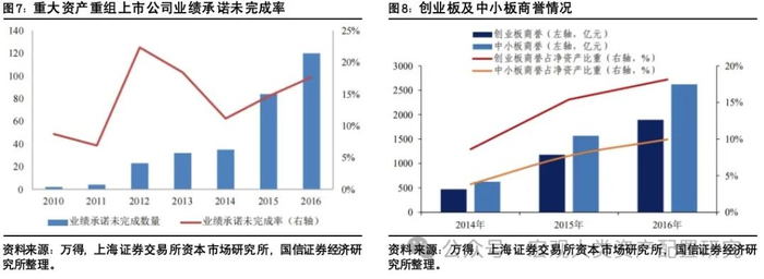 小部分上市公司将并购重组作为题材炒作的一种手段,以此影响二级市场股价。当时政策环境较为宽松,法律法规未对重大资产重组的具体交易合同设定前置许可的具体生效要件,证监会也就无权要求当事人严格按照合同履约,为欺瞒式重组提供了可乘之机。再加上当时市场普遍将并购重组视为利好,而忽视了背后的风险,这与当时宏观经济环境有关,彼时宏观经济发展进入新常态,自上而下对于转型发展具有迫切的需求,而转型发展,整合产业链等恰好是并购重组最显眼的标签,并购重组也因此完美地迎合了市场的期待,导致市场对并购重组的反应较为敏感。因此,上市公司发布并购重组预案后,其股价几乎是立竿见影的上涨。高溢价并购导致上市公司商誉快速增长,埋下商誉减值隐患。2014年至2016年并购重组高峰期,资产重组溢价率逐年攀升,2016年估值溢价率已经高达862%,高溢价并购导致上市公司商誉快速增长,而并购后业绩变脸埋下了商誉减值的隐患。部分上市公司并购重组后未能产生“1+1>2”的协同效应,并购完成后业绩变脸,可能会导致商誉减值风险,严重时会侵蚀上市公司的利润。2014年至2016年,列报商誉的上市公司数量占比持续提高。