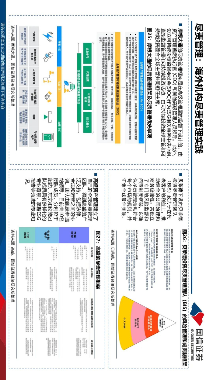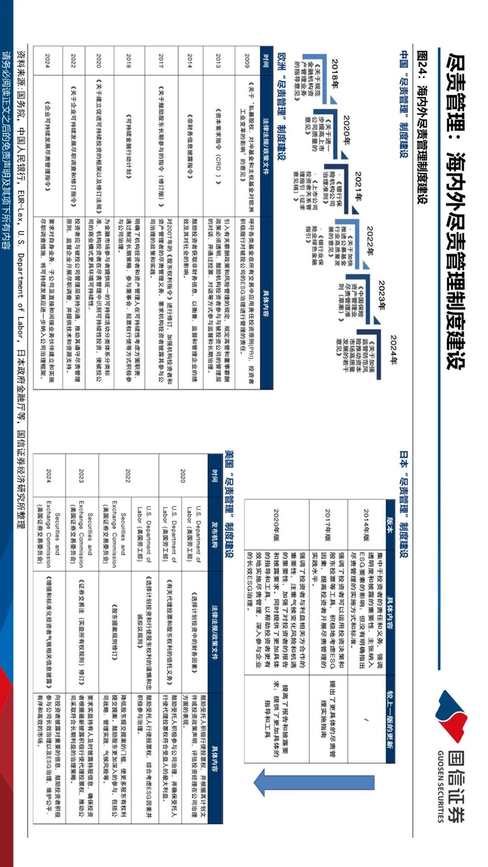 ESG生态圈:尽责管理制度建设促进生态圈各组成部分协力合作与一体性提升。ESG投资生态圈由监管机构、企业、评级机构、投资机构共同组成,信息披露作为生态圈体系的基础环节,需要政府机构的强制力保障。伴随机构成熟度提升、公司治理结构复杂化、监管机构角色强化,尽责管理逐渐成熟。过去10年发达资本市场持续修订尽责管理相关守则,与信披制度螺旋向上共同发展,伴随新“国九条”为尽责管理提供政策推力,险资机构细化尽责管理内涵及开展路径,ESG生态圈内一体性有望进一步提升。