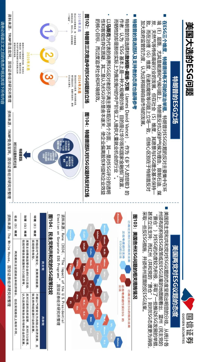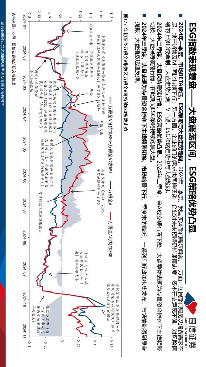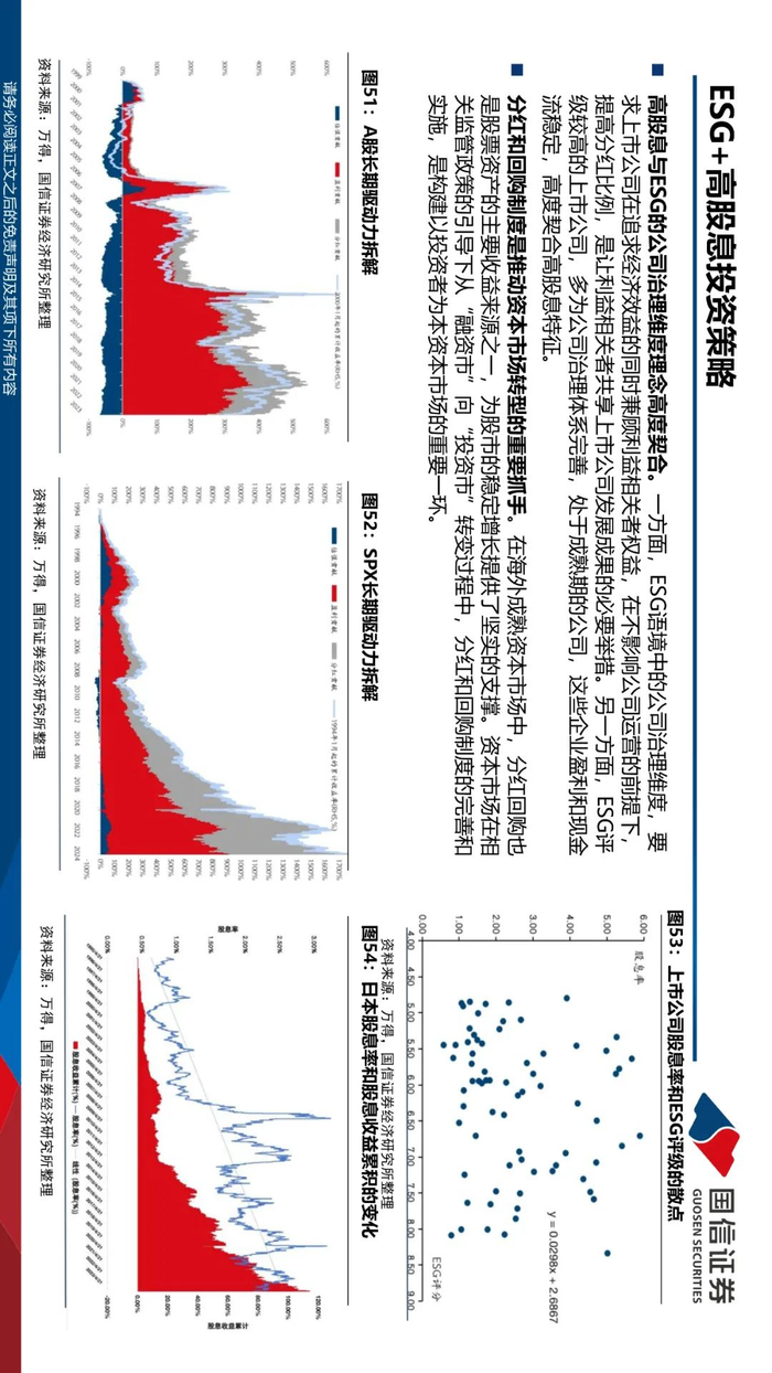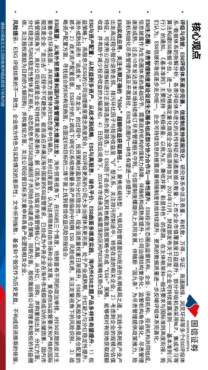 ESG展望:从海外贸易情景和国内市值管理两大维度出发。海外贸易视角下,在ESG的三个维度,特朗普有不同的政治举措,对ESG议题的反对主要集中在环境层面。共和党方面整体对ESG态度中性偏负,反对过度监管,认为这将限制自由市场和企业发展。复杂的ESG监管要求和严格的国际规范是企业“走出去”过程中不可避免的,能否适应并满足海外国家的ESG监管要求,已经成为中资企业在海外市场取得成功的关键因素。国内市值管理视角下,良好公司治理是企业可持续发展必要条件,新《国九条》后锚定市值管理核心工具箱,从分红、回购、并购重组出发。分红方面,分红稳定性与ROE稳定性整体呈正相关,动态股息率与ESG治理端因子共同结合构建底仓策略;回购方面,股权激励将公司管理者和股权的利益捆绑,关注股权激励为目的的大额回购;并购重组方面,关注公司经营目标多次重申和具备产业逻辑相关企业。