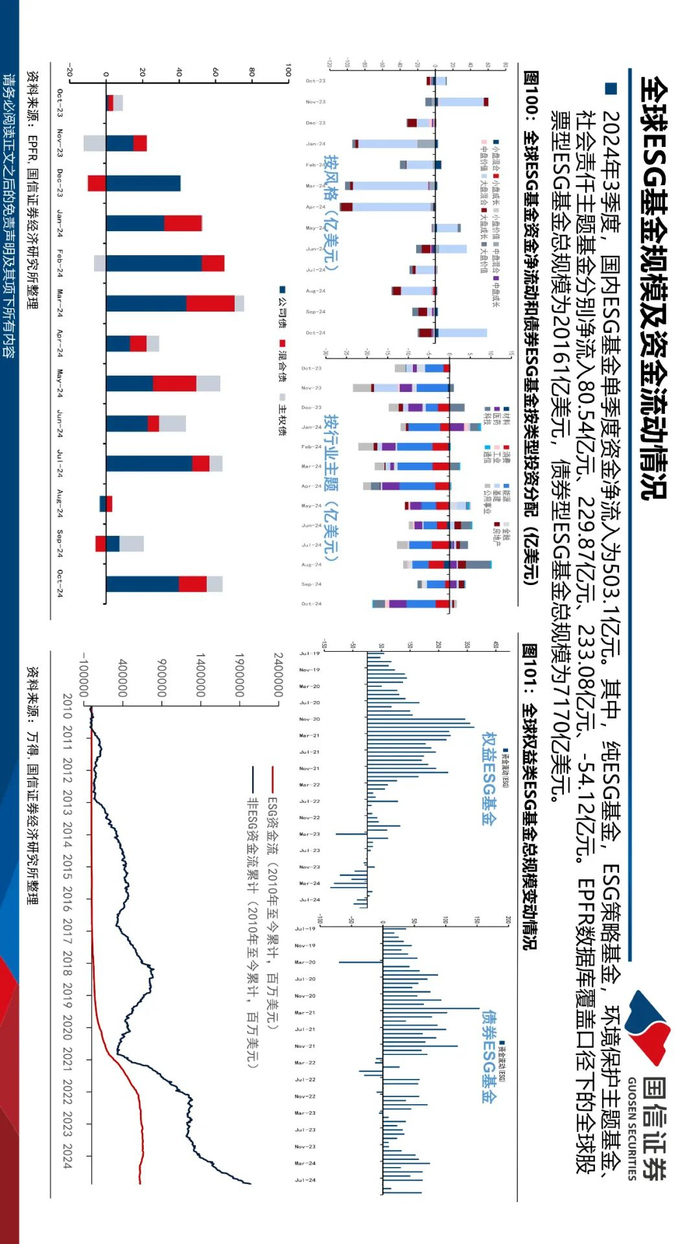 评级与信披:ESG评级体系逐步完善,信披制度持续规范化。研究体系中涉及易董、有机数、万得、华证、商道融绿、润灵环球等多个ESG评级体系/数据体系的拆解分析,各类评级体系进化的共性特征在涵盖数据点数量、上市企业市值覆盖度日益提升,部分评级机构采用NLP、集成学习等算法构建ESG数据平台,进一步为精确定量化微观企业评级添砖加瓦。2024年12月,财政部发布关于印发《企业可持续披露准则——基本准则(试行)》的通知,《基本准则》主要坚持“积极借鉴、以我为主、兼收并蓄、彰显特色”的思路,在主体框架和一般性要求与国际准则高度衔接。我们认为,ESG信披标准或逐步走向统一,企业可持续信息的披露质量将随制度供给持续提升,更高的数据质量进一步反哺评级体系完善化。