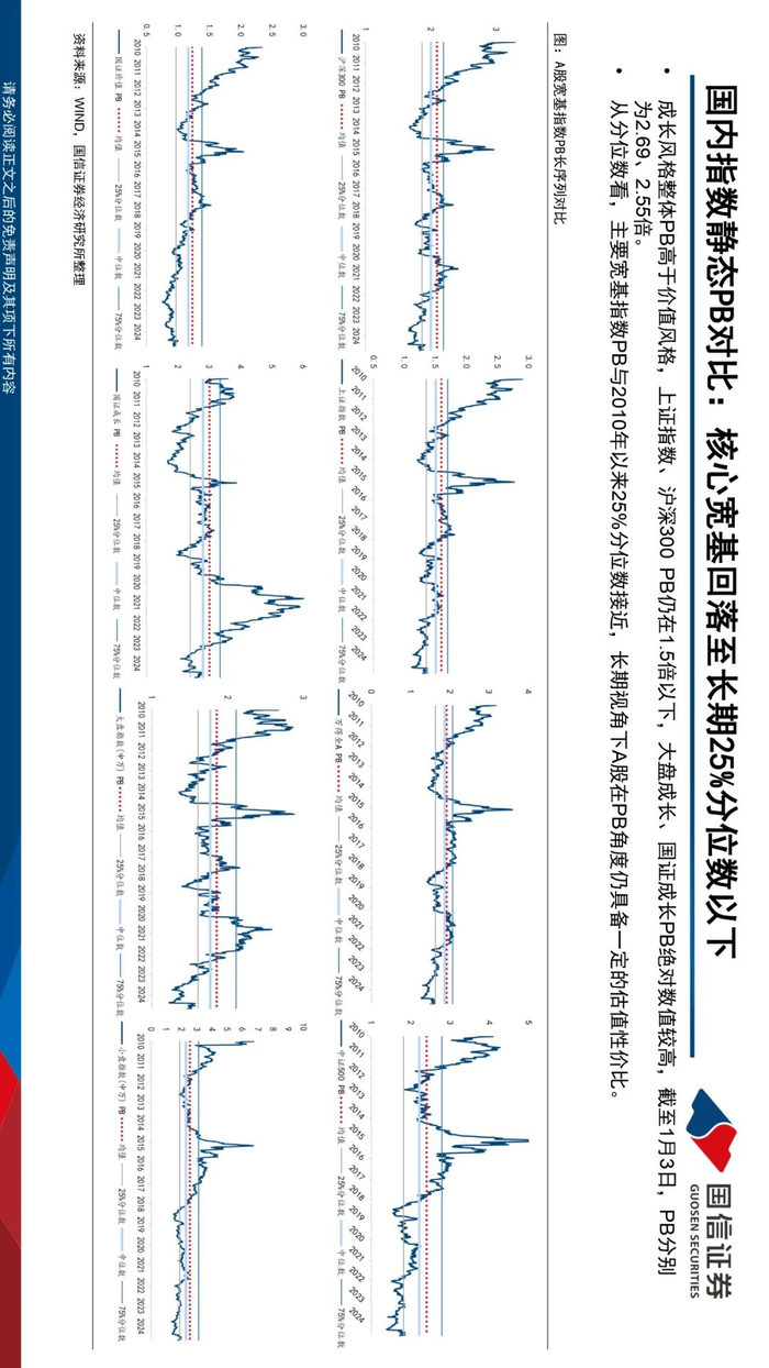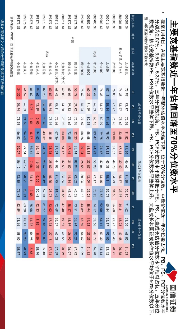 近A股核心宽基整体估值收缩,大盘相对更扛跌。规模上来看,中证1000、国证2000、中证2000PE分别大幅收缩3.17、3.76、8.21倍。风格指数中成长指数PE收缩幅度大于价值,小盘指数PE收缩幅度最大达3.49倍。截至1月3日,A股主要宽基指数近一年整体估值水平大幅下降,位于70%分位数。中盘价值近一年分位数占优,PB、PS、PCF分位数水平分别为2.07%、3.51%、5.37%。三年分位数视角,PB、PCF分位数水平整体低于PE、PS,大盘成长估值分位数水平相对占优。五年分位数视角,核心宽基指数PE、PS分位数水平整体下跌,PB、PCF分位数水平整体上升,大盘成长和国证成长估值水平均位于50%分位数以下。