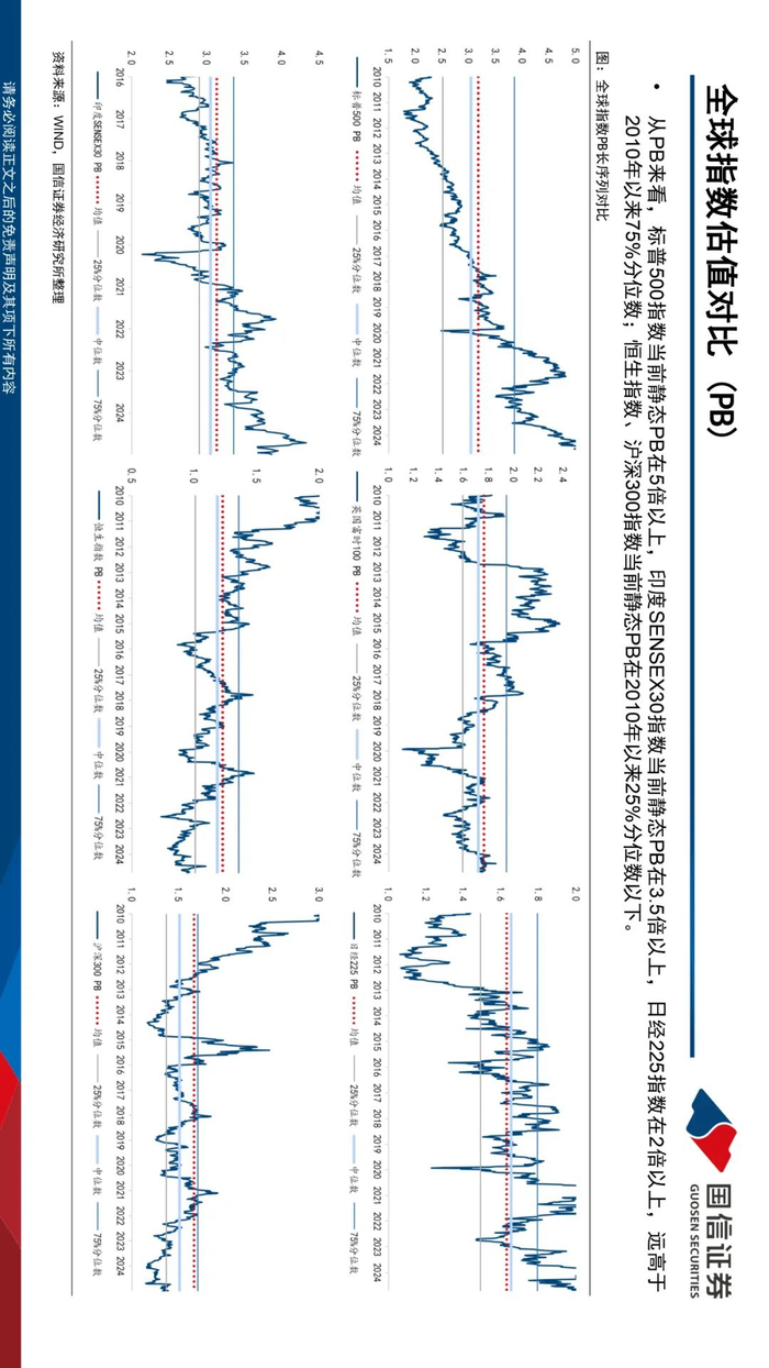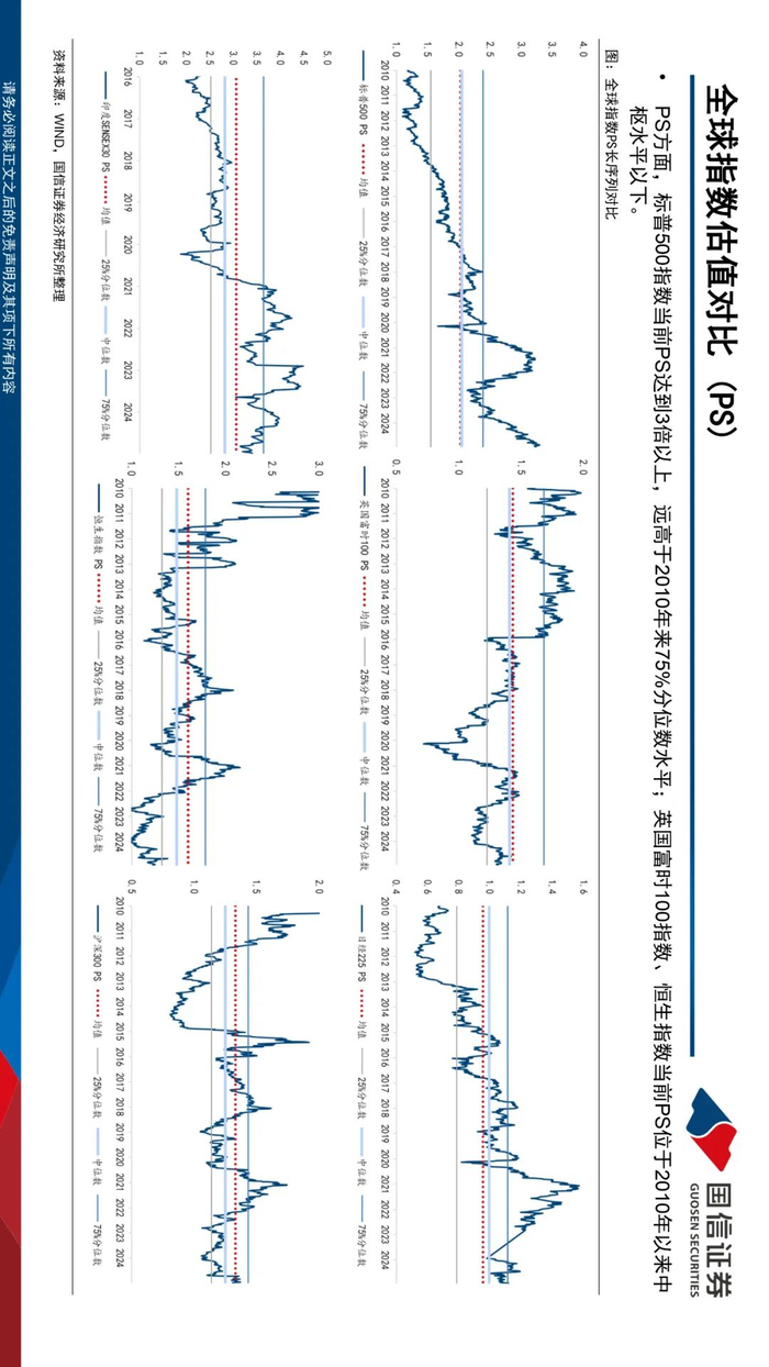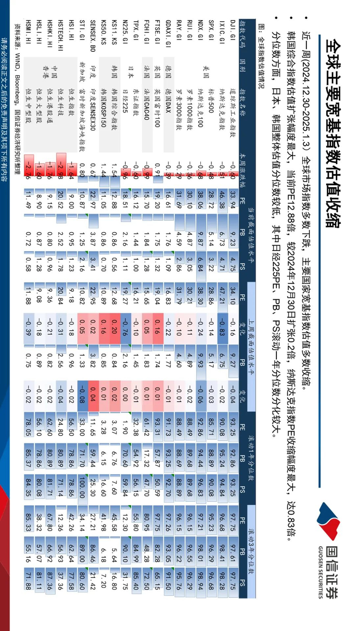 全球主要国家宽基指数估值收缩。近一周(2024.12.30-2025.1.3)全球市场指数多数下跌,主要国家宽基指数估值多数收缩。韩国综合指数估值扩张幅度最大,当前PE12.88倍,较2024年12月30日扩张0.2倍,纳斯达克指数PE收缩幅度最大,达0.83倍。分位数方面,日本、韩国整体估值分位数较低,其中日经225PE、PB、PS滚动一年分位数分化较大。