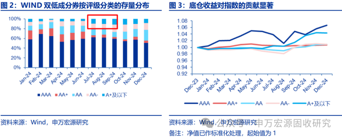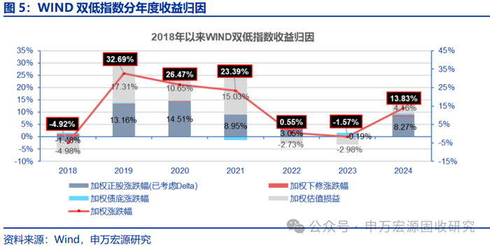 成份券结构上,WIND双低指数表现好的原因可主要归因于三个方面:第一,高评级转债占仓位比重较高,如图2所示。2024全年指数成份中评级在AAA及AA+的转债权重占比高,余额加权下指数更偏重于银行、公用事业等大盘转债。契合全年指数风格下,年度对指数整体收益贡献显著,如图3所示。