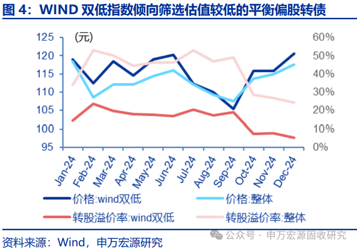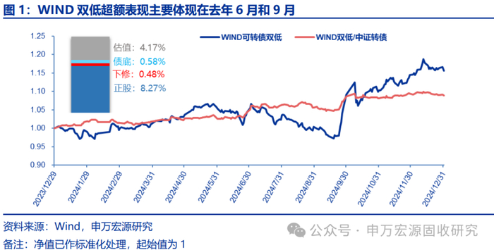 综上,2024年WIND双低指数表现优异,正贡献主要来源于正股和估值。仓位上,大盘转债的高占比贴合全年大类风格,底仓收益贡献显著。择时上,较为精准的自7月起增加低评级转债的仓位,后续低价转债及权益反弹后小盘风格回归下,净值持续增长。最后,配置风格上,长期倾向配置低转股溢价率的平衡偏股转债有益于组合获取估值正收益。