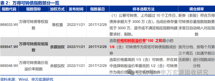 WIND双低的指数编制规则,主要有以下3个特点:1)以价格和转股溢价率*100之和的值做升序排名。与以价格和转股溢价率分别升序排名后加总的方式有所不同,WIND双低会更偏重于转股溢价率较低的转债;2)评级、剩余期限及规模无限制,样本范围较宽;3)调仓时点在每个月第三个周五,与月末调整的时点不同。