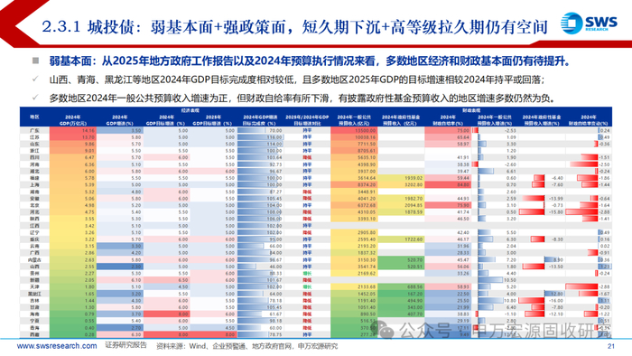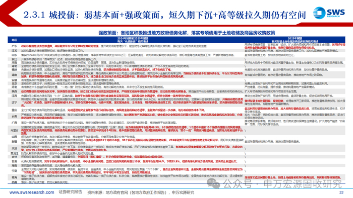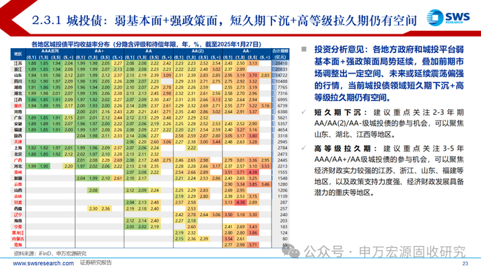 城投债:弱基本面+强政策面,短久期下沉(重点关注2-3年期AA/AA(2)/AA-级,可以聚焦山东、湖北、江西等地区)+高等级拉久期(重点关注3-5年AAA/AA+/AA级,可以聚焦经济财政实力较强的江苏、浙江、山东、福建等地区,以及政策支持力度强、经济财政发展具备潜力的重庆等地区)仍有空间。