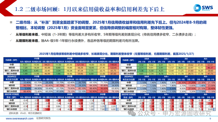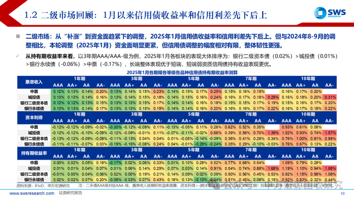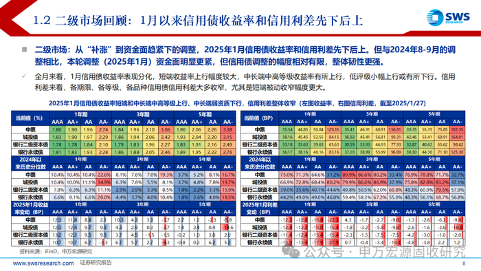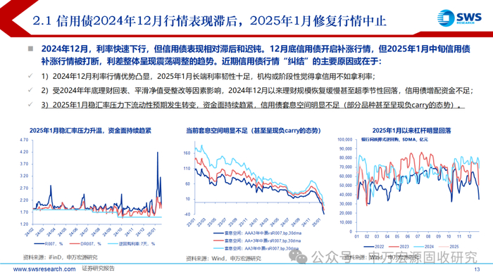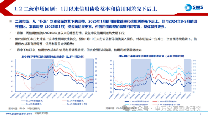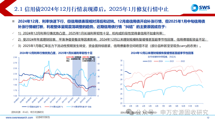2024年12月,利率快速下行,但信用债表现相对滞后和迟钝。12月底信用债开启补涨行情,但2025年1月中旬被打断,利差整体呈现震荡调整的趋势。