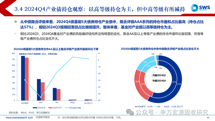 - 信用下沉策略延续:AA及以下中低隐含评级的占比小幅回落,由2024Q3的13.42%回落至2024Q4的13.25%,但仍保持相对高位。