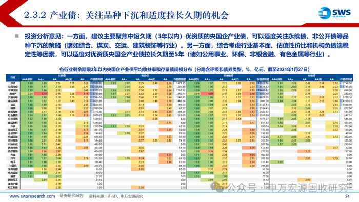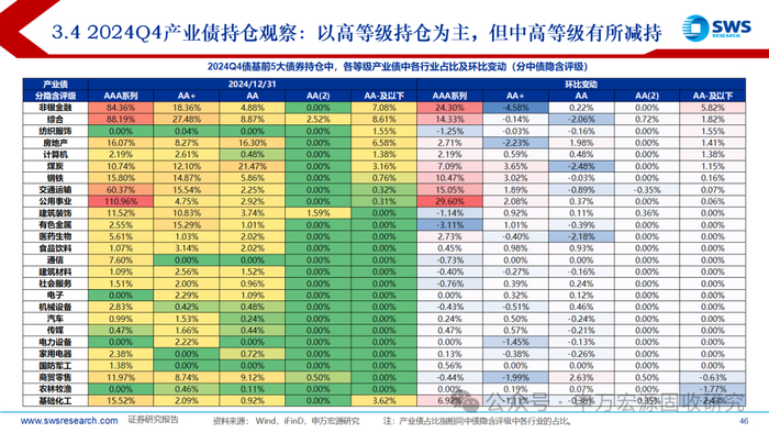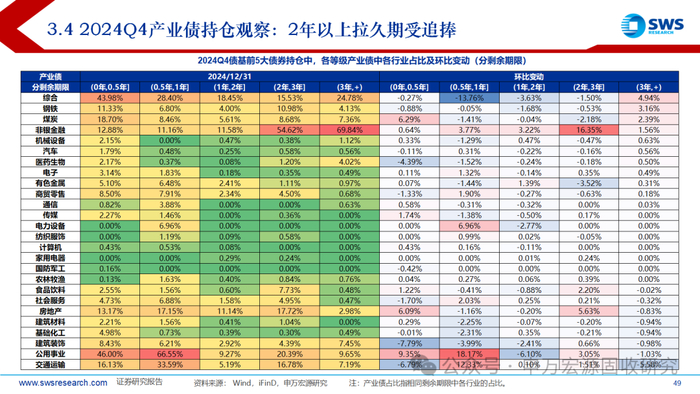产业债:2024Q4持仓占比3.00%(2024Q3为3.31%),以高等级持仓为主,但中高等级有所减持,2年以上拉久期受追捧;地产债和煤炭债持仓增多、钢铁债持仓下降,其中地产债以哑铃策略为主,但适度下沉有所抬头,煤炭债和钢铁债以中高等级哑铃策略为主;