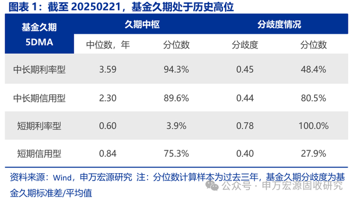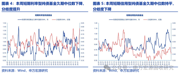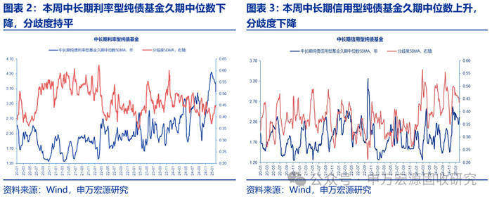 1. 本周纯债基金久期中位数上升、分歧度下降
