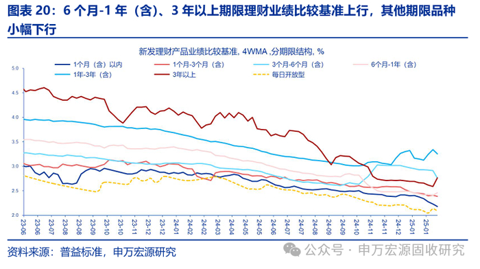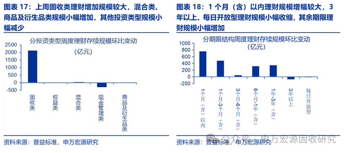 上周全市场理财存续规模周度环比上升1867.10亿元,增加规模符合季节性。分期限来看,上周期限为1个月(含)以内理财规模增幅较大,期限为3年以上和每日开放型理财规模收缩,其余期限理财规模小幅增加。分投资性质来看,上周固收类理财增加规模较大,混合类、商品及衍生品类理财规模小幅增加,其他投资类型理财规模小幅减少。分期限来看上周新发理财产品业绩比较基准,6个月-1年(含)、3年以上期限理财业绩比较基准上行,其他期限品种小幅下行。