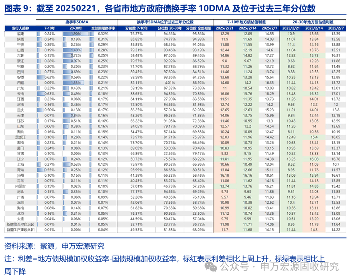 本周各品种债券换手率普遍环比上行,长期限利率债上行幅度较大。长期限债换手率多处于高位,截至20250221,7-10年(含)国开债换手率10DMA处于近三年以来99.8%分位数水平。短期限债换手率多处于低位,截至20250221,1年及以下企业债和银行二级债换手率10DMA分别位于近三年以来9.0%、0.1%分位数水平。地方债换手率分区域比较来看,大多处于高位,截至20250221,福建、陕西、宁波地方债换手率较高,其换手率10DMA分别位于近三年以来95.9%、94.9%、91.1%分位数水平。