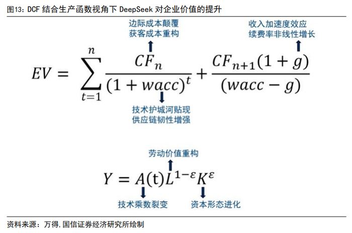 从DCF模型出发,大模型之于企业价值提升的传导机制在于现金流生成的范式迁移。1)短期现金流结构优化主要体现在边际成本降低和获客成本重构上;2)小样本终身学习持续迭代的特质使得客户净留存率有所提升,续费率非线性增长。与此同时,企业可快速组合AI能力形成新产品,产品矩阵迭代成本降低,收入加速度效应提升;3)通过技术护城河贴现和供应链韧性提升实现长期风险溢价压缩。