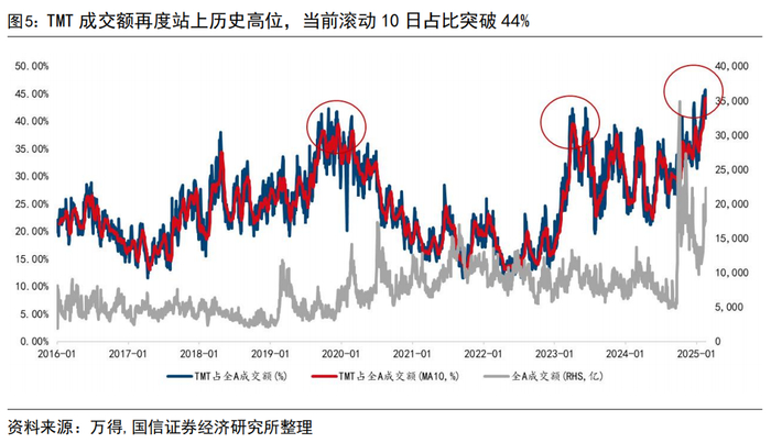 1)题材容量:策略容量较小的题材,核心标的断板补跌往往确认主题情绪的阶段性熄火,大容量题材在成交赶顶的过程中仍能通过扩散接续避免短期情绪过热;2)情绪周期:涨停家数尚可,“2进3”晋级率不低,算力和机器人产业链中位连板核心标的数量充足;3)历史回顾:上轮“茅”“宁”经历了至少2-3轮的“成交额破前高→构筑新中枢”的过程,,当前 TMT 板块成交热度占比仅为第一次破前高,未出现长期性、系统性地热度中枢抬升。