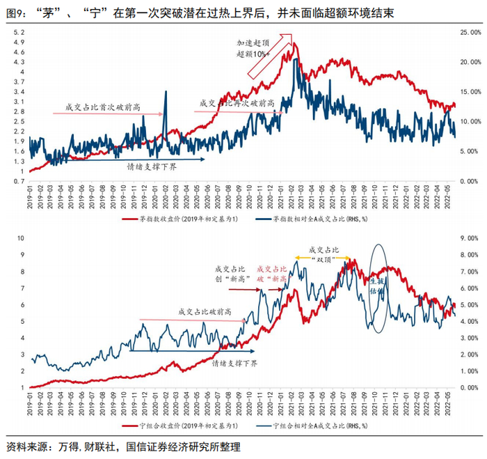 以上一轮机构抱团的核心资产为例,茅、宁成交热度占比首破前高、再创新高后,超额环境并未完全消失。1)茅指数:2019年伊始,茅指数相对全A的成交占比大约在5%-7%之间,2019年11月底第一次达到10%,此时茅指数相对年初上涨超过80%。成交额突破10%后,茅指数情绪有所下降,2020年2月受全A成交额影响,成交占比一度被动上升至15%。实际上对于前高10%的二次有效突破出现在2020年10月末,2020年11月至2021年3月初茅指数赶顶过程中上涨21%,相对全A超额收益仍达到11%+;2)宁组合:整个2020年,宁组合3次尝试突破2019年底的成交占比区间顶,2020年10月末突破成功,成交额占比快速上升至4%以上,2021年1月中旬突破11月中5.6%的区间高点,突破后宁组合仍继续上涨超过1个月,2021年8月成交额占比筑双顶才是宁组合成交过热的标志。整个过程中,宁组合出现两次成交热度破新高后的系统性中枢抬升并创造超额。对标茅、宁热度与超额的多阶段提升过程,当前TMT板块成交热度占比仅为第一次破前高,并未出现系统性地热度中枢抬升,直言过热为时尚早。