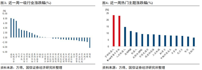 近一周主要指数震荡上涨,AI+机器人领跑。近一周A股市场先抑后扬,上半周小幅调整后下半周持续向上。伴随阿里资本开支超预期,下半周科技主线实现自我强化,周五恒生科技、科创50、科创综指分别收涨6.53%、5.97%、4.38%。科创综指突破10月8日、11月12日两个区间高点。风格上看,中小盘相对大盘表现更好,但微盘股赚钱效应并非最佳。不同于风格因子驱动的结构性上涨行情,由产业趋势或核心催化驱动的产业核心带动边缘资产扩散上涨的行情中,与产业风格相匹配的市值风格往往强于纯微盘股。科创50单周上涨7.07%领跑市场,以上证指数、沪深300、中证500为代表的中大盘风格表现相对较弱,全周涨幅不足2%。行业层面看,AI、机器人含量较高的通信、机械、电子、汽车、计算机本周领涨,主题层面则聚焦于宇树机器人和恒生半导体,上述两个概念的核心标的整体涨幅在20%以上。