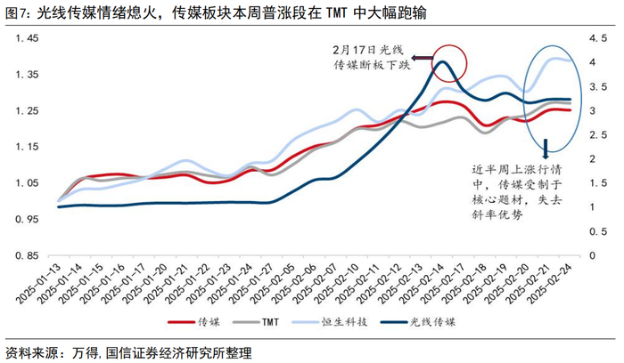 策略容量较小的题材,核心标的断板补跌往往确认主题情绪的阶段性熄火,大容量题材在成交赶顶的过程中仍能通过扩散接续避免短期情绪过热。以近期较为火爆的“哪吒概念”为例,春节档电影《哪吒2》票房屡创新高,背后的主要投资方、主出品的光线传媒在2月5日首板启动,2月10日后开启连板,传媒板块前期领涨TMT。2月17日光线传媒断板下跌,传媒板块受拖累,单日跌幅领跌TMT,在后半周科技成长普涨行情中,主题情绪弹性不佳。但对于AI和机器人来说,当前核心标的并未出现情绪熄火,且主题容量更大,题材能够扩散、梯队也相对完整的情况下,成交、换手突破历史高位并不意味着情绪层面的绝对过热。