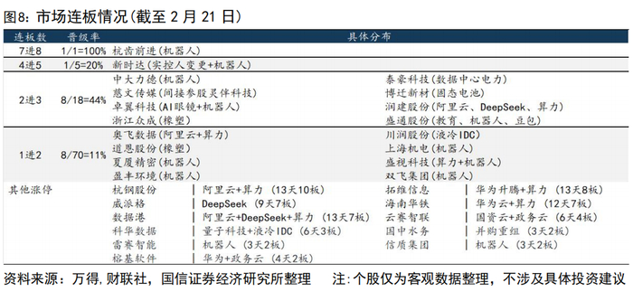 从题材整体的情绪周期看,当前同样指向科技行情并未结束。我们可以用炸板率、晋级率以及市场整体情况对题材本身进行观测:1)上周后半周连板指数日涨幅均小于5%,但是7进8、2进3的晋级率并不低;2)从涨停家数情况看,涨停家数并未呈现明显递减趋势。3)具体到连板标的上看,基本集中在AI和机器人方面,题材想要成为主线,在快速上涨的行情中必须具有低位连板(1进2)、中位连板(3-6板)、高位连板(7个以上)的金字塔结构,中位连板作为交投情绪的接续中枢助力题材创新高,当前AI和机器人板块前排中位连板标的储备数量相对充足。