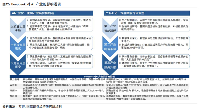 AI+机器人是产业层面的“大重估”。1)DeepSeek 模型的弯道超车,国产大模型实现算力平权,不同于泛消费领域 C 端“质价比”逻辑,国产大模型质价比提升驱动下游应用爆发式增长,同时反哺 B 端收入、提升 C 端利润率;2)DCF视角:大模型之于企业价值提升的传导机制在于现金流生成的范式迁移;3)从生产函数出发,重估体现在对生产函数的重定义,具体包括技术乘数裂变、资本形态进化(K→KAI)、劳动价值重构。