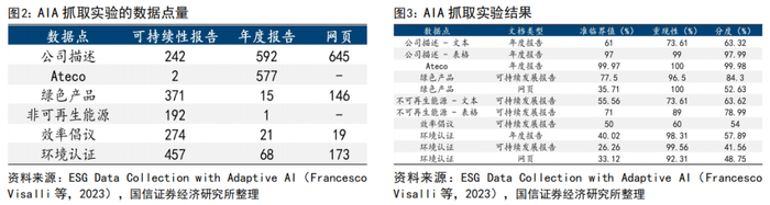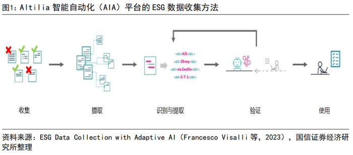 Francesco Visalli等提出了一种基于Altilia智能自动化(AIA)平台的ESG数据收集方法。该方法能够从包括年度报告、可持续性报告、财务报表附注、新闻、非政府组织报告以及通过网页抓取技术获得的公司网站等多种文档和内容中收集数据。AIA平台基于混合和自适应AI范式,利用深度学习算法进行计算机视觉(CV)和自然语言处理(NLP)。特别是结合了大型语言模型、Human-In-The-Loop、持续学习、知识表示方法来实现机器阅读理解技术,将非结构化文档转化为结构化数据,并提供许多不同的ESG相关问题的答案。具体来看,AIA平台通过数据收集、摄取、识别与提取、验证和使用等步骤,构建了一个端到端的ESG数据收集工作流程。