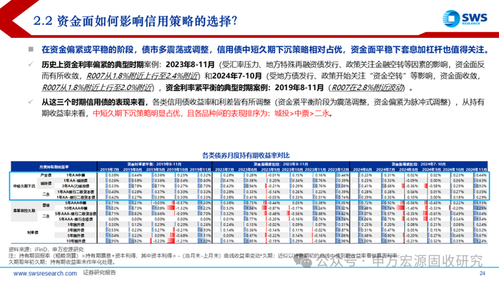 历史上资金利率偏紧的典型时期案例:2023年8-11月和2024年7-10月,资金利率紧平衡的典型时期案例:2019年8-11月。从这三个时期信用债的表现来看,各类信用债收益率和利差皆有所调整(资金紧平衡阶段为震荡调整,资金偏紧为脉冲式调整),从持有期收益率来看,中短久期下沉策略明显占优,且各品种间的表现排序为:城投>中票>二永。