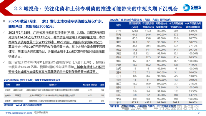 截至2025年3月末,已有30地披露发行再融资专项债,募资用于置换存量隐性债务,规模合计为13372.75亿元,发行进度已接近70%;(拟)发行土地收储专项债的区域仅广东、四川两地,总规模超300亿元;