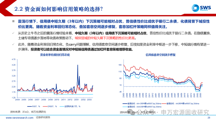 震荡行情下,信用债中短久期(3年以内)下沉策略可能相对占优,普信债性价比或优于银行二永债,化债背景下城投性价比更高。随着资金利率回归常态化,叠加套息空间逐步修复,套息加杠杆策略同样值得关注。