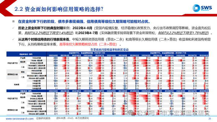 历史上资金利率下行的典型时期包括2022年4-8月和2023年4-7月。从这两个时期信用债的行情表现来看,中短久期弱资质信用债(普信>二永)和高等级长久期信用债(二永>普信)收益率和利差皆有明显下行,从持有期收益率来看,高等级拉久期策略明显占优(二永>普信) 。