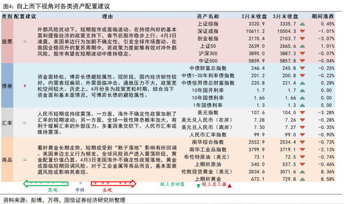 外部风险扰动下,短期股市或面临波动。在持续向好的基本面和提振经济的政策支持下,春节后股市稳步上行。4月3日凌晨,美国单边行为加剧不确定性,引发全球市场轰动。在我国企稳回升的复苏周期中,若政策力度能够有效对冲外部风险,股市有望在短期波动中维持稳定。